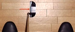 | この半年ぐらい、やたらと「左向き」だの「真っ直ぐ」だのとフェースの向きについて書くようになりました。きっかけは久津間さんのクラブと出会っちゃった、って事なんですけどね(笑)。ミズノの掲示板やジョイメニーの喜多さんの掲示板などで質問してみたりしてますが、メーカーが公式に本音を言うってのは、まあ、無理でしょう(笑)。 私は久津間さんに教わったり、蟲仲間で勉強したりして自分なりの指標を持っています。でも、専門家じゃないのであくまで「素人的感覚」なんですよね(笑)。アイアンやウッドの場合、ヘッドの運動が三次元的になるので私の脳味噌では定量的分析がまだできない。と、いうわけで問題を単純化できるパターを例にしてフェースの向きについて実験君になってみます。 写真は久津間さんに完全調整してもらったキャメロンのデルマー2。フェースにはロングティを両面テープで貼り付けてあります。首領の場合、ボール位置は左足寄りに置きます。カメラのレンズ位置が左に来るのでシャフトが左から入っている様に見えますが、実際には右から入っています。長さ、ロフト、ライ、重量とバランス、全てを首領に合わせて調整してあるので、目をつぶってグリップを決めて(正面の平らな部分とバックラインの感触で)スッと置けば、写真の様にフェースが真っ直ぐになるようになっています。 こちらは入手したばかりのヒロ・マツモトのMZ-09。同じように目をつぶってグリップを決めると写真の様にフェースがかぶって左側を向いてしまいます。 要素としてはシャフトの入り方が左から入りすぎている、グリップがかぶって刺さっている、などが考えられますが、このままボールを打てば当然の如く引っかけが出てしまいますね(笑)。市販のパターではこういうパターンが非常に多くなっており、高いお金を出して手に入れたパターなのに、ここ一番で引っかけがでてしまう・・なんてのはフェースの向きを疑いましょう(笑)。 写真のフェースの向きは真っ直ぐになっています。そうです、ボール位置を変えたんですね。グリップ位置をそのままでボール位置だけずらすとロフトが変わってしまうのでグリップ位置も変えざるを得ません。 PINGやキャメロンなどは身体の中央にボールを置いて、ハンドファーストの構えで最適なロフトになるように設定されている・・というのを聞いたことがあります。グリップを身体正面でボール位置を右足に移したこのケースはそれと等価になりますね。ポイントは「MZ-09は左を向いている」ではなくて、「MZ-09の最適セットアップポイントは首領のソレとは異なっている」ということです。 「首領にとって左を向いている」わけで、ボールを右足側に寄せる人にとっては真っ直ぐなパターと言えるわけです。なにしろ、パッティングってのは千差万別な構えが存在します。結局、エースパターに合ったポイントを自分の構えにしちゃうか、自分の構えに合わせてパターを調整してやるのがポイントになるわけです。パターを変えたらとたんに入らなくなった・・そういう経験ありませんか? パターを調整しないのなら構えを変えないと条件が同じにならないってわけです。写真はエイリアンのマレット。アメリカでエースとしてつかっていたんですが、はずすときは必ずカップの左に外してました。あらためてチェックしたら・・こんなに左向いてます。ただし、この場合はグリップがかなりかぶって刺さってたんですけどね。 写真はドライバーで同じようにティペグを貼り付けて並べたもの。前述したように、アイアンやウッドのヘッドの動きは前後に加えてトゥ・ダウンという3次元的な動きが加わるのでインパクト時のフェースの向きというのは直感的にしか私には説明できません(笑)。参考までに・・ということでいくつかのヘッドを並べてみました。 左からウッドブロスのパーシモン、久津間250チタン、キャラウェイのウォーバード、ミズノのノータスチタンの順です。メーカーによってシャフトの入り方のばらつきが存在するので、一般論としてではなく、首領の買ったクラブ固有の問題ということで説明しておきます。 ウッドブロスはオープン、久津間250がスクウェア、ウォーバードがフックで、ノータスはド・フックということになりますね。ただし、これらの写真はヘッドをスッと置いた状態でのモノ。グリップしてボールを打つように浮かせた場合、グリップの刺し方にも寄りますがもっと極端になります。上の例ではウッドブロスと久津間250はストレートに、ウォーバードとノータスは無茶苦茶左向くように感じられます。 ノータスのヘッドを正面から写したのが左の写真。ヘッド上のロゴの向きとフローリングの線が真っ直ぐになっていることに注意。それに対してティの向きは思いっきり左向いています。 前述したようにヘッドをソールした状態での写真だし、カメラアングルの影響もあるので定量的な解説ではなく、「ほら、左