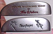 ![]() はっ・・いつのまにまたフラットバックアイアンとパーシモンのセットが・・(爆) ええ、なんか妙に50年代から60年代のクラブが集まってくるんですよね。写真はマクレガーのアイアンを中心にした、いわゆる「平背柿L字セット」。 ヤフーのオークションってのは、珍しいモノというか、流通しないようなモノがまだまだでてるんだよね。あ、流通しないって意味は高価ってわけじゃなくて、中古ショップではだれも買わないので処分されるかもしれない・・って感じ。 さて、今回のセットですがアイアンはマクレガーのフラットバック。てり先生のお見立てによるとカスタムオーダーのモノらしくかなり無茶な値段が付いてたらしい(笑)。アイアンは1番からPWのセットでSWはリンクスのマスターモデル(写真一番手前)。 ![]() ウッドはまとめて処分・・ということで5本ついていました。オーダーの1Wが2本、M85TWの3と5W、そして写真のトニーペナのヴェロシタイズドPT1W。 セット全てが使い込まれており、ウッドもアイアンもリシャフトや調整が細かくなされており、飾って楽しむクラブではなく実戦でバリバリ闘うクラブにしあがっています。 写真のPT1Wですが、色といい、木目といい美しいとはおもいませんか? まあ、このへんは完全に趣味の世界ですから(笑)、最新のチタンドライバーに美しさを見いだしてもそれはそれで楽しいことですけどね。蟲仲間の一人に、フラットバックとかパーシモンを自分の子供や孫に伝えたい、って言ってるヤツがいます。「ほら、昔はこんなクラブがラウンドしてたんだ」と、未来に残すべき遺産だと私も思います(笑)。 ![]() はっ?も、もしやこれはまたまたジョージ・ロータイプのパターではあるまいか? ← 見ればわかります んー、こないだマクレガーのニクラウスを紹介したばかりなんですが、また増えちゃった。 ・・っていうか、セット写真にこのパターがチラッと写っていたからセットを落札したんだよね(笑)。ったく、いったい何種類そろえれば気が済むんだろう? で、このパターの正体ですが、RAMのWIZARD600のトム・ワトソンモデルです。 フェース面の写真、上がワトソンで下がニクラウス。上からの写真は左がワトソンで右がニクラウス。基本形状は同じような感じですが、曲線の処理の違いでワトソンの方は8802的な半月タイプに近いイメージです。とくに、トップブレードが薄いため構えた感じはジョージ・ローの力強さが感じられません。 バランスもちょっと軽めだし構えた感じが、トップブレードの薄さによってボールに当たり負けしそうな気がしてちょっと不安(笑)。しかしまあ・・WIZARD600の兄弟っていったいどれぐらいいるんだろう? まだまだ探せば出てきそうだなぁ・・ 首領のお薦め度: 平背柿L字は次の世代に伝えよう・・・・ 78点! |